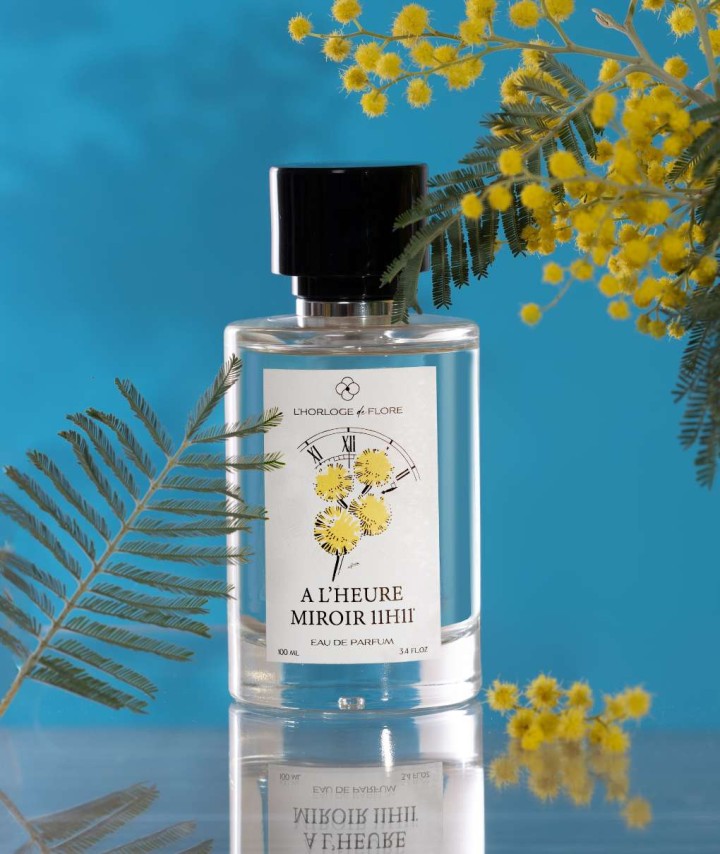 À L’Heure Miroir 11H11 célèbre l’optimisme. Le Mimosa, baigné de soleil, s’épanouit avec les accents amandés de la fleur d’héliotrope et la chaleur du bois de santal. Les grappes dorées de mimosa, caressées par le soleil hivernal, libèrent leur parfum délicat.